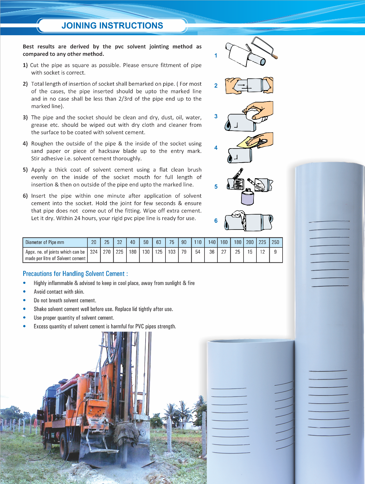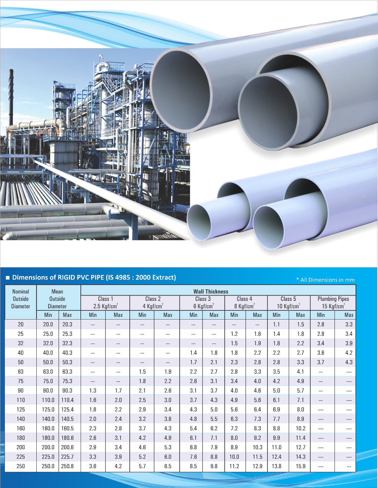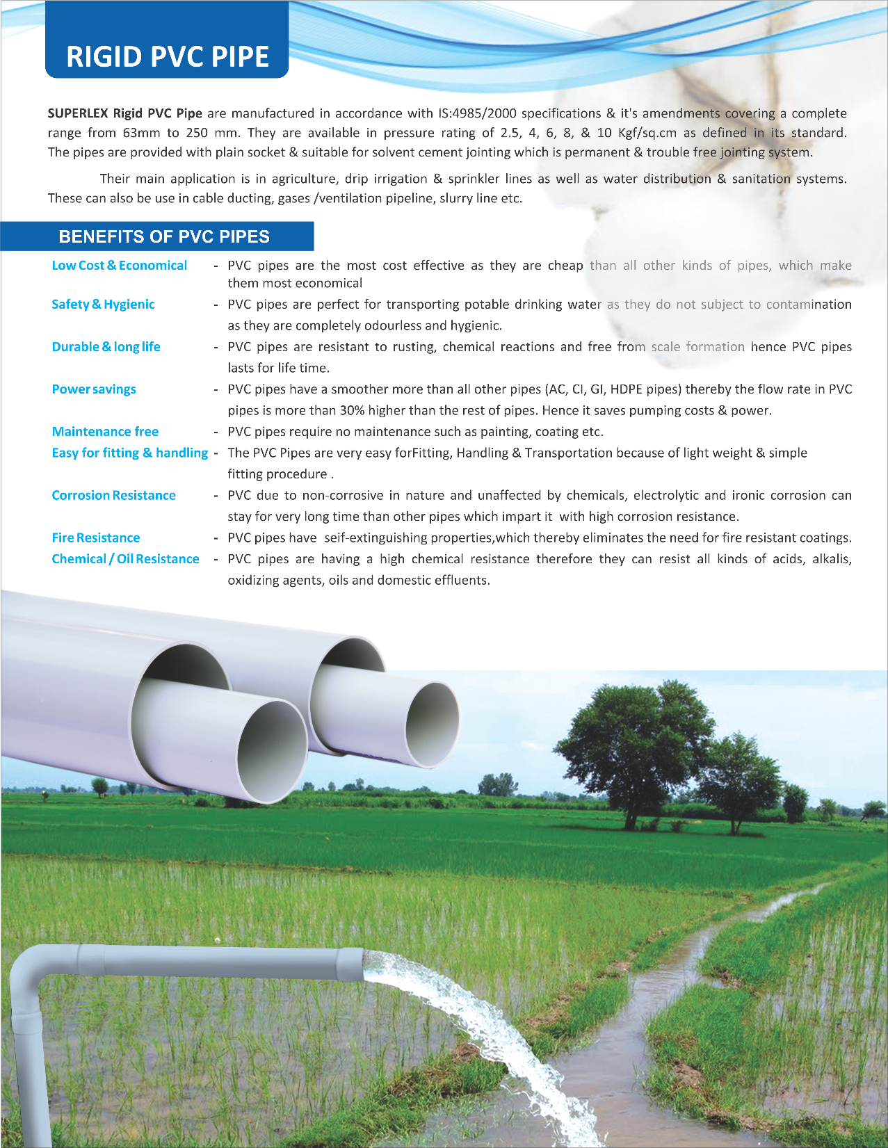 The company has been devoted to the quality of its products. Its comperehensive quality program has always been based on continuous improvement in products, process & Systems. The extrusion of pipes is done with latest technology. We have dedicated ourselves to the needs of frarmers, water transportation, drainage, borewells, teleom cable ductings, plumbing systems etc. For these purpose we are manufacturing wide range of PVC pipe from 20mm to 250mm O.D. The Company always believes in Quality